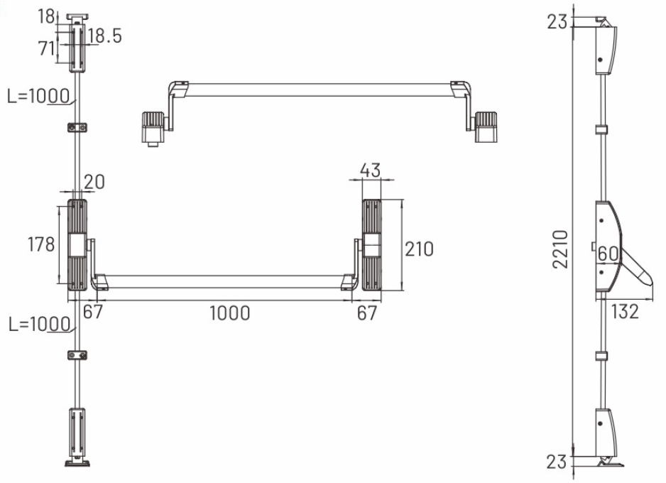 Реверсивная горизонтальная антипаниковая ручка нажимного типа с двумя точками запирания. В комплект входят: механизм паник-бар, верхняя и нижняя защелки, установочные крепежные пластины, вертикальные тяги, перекладина красного или зеленого цвета длиной 1000 мм, ответные планки. Подходит для дверей с шириной створки до 1165 мм и высотой (h) до 2250 мм. Для створок высотой до 2450 мм необходимо использовать удлиненную тягу 1400 мм (опция).