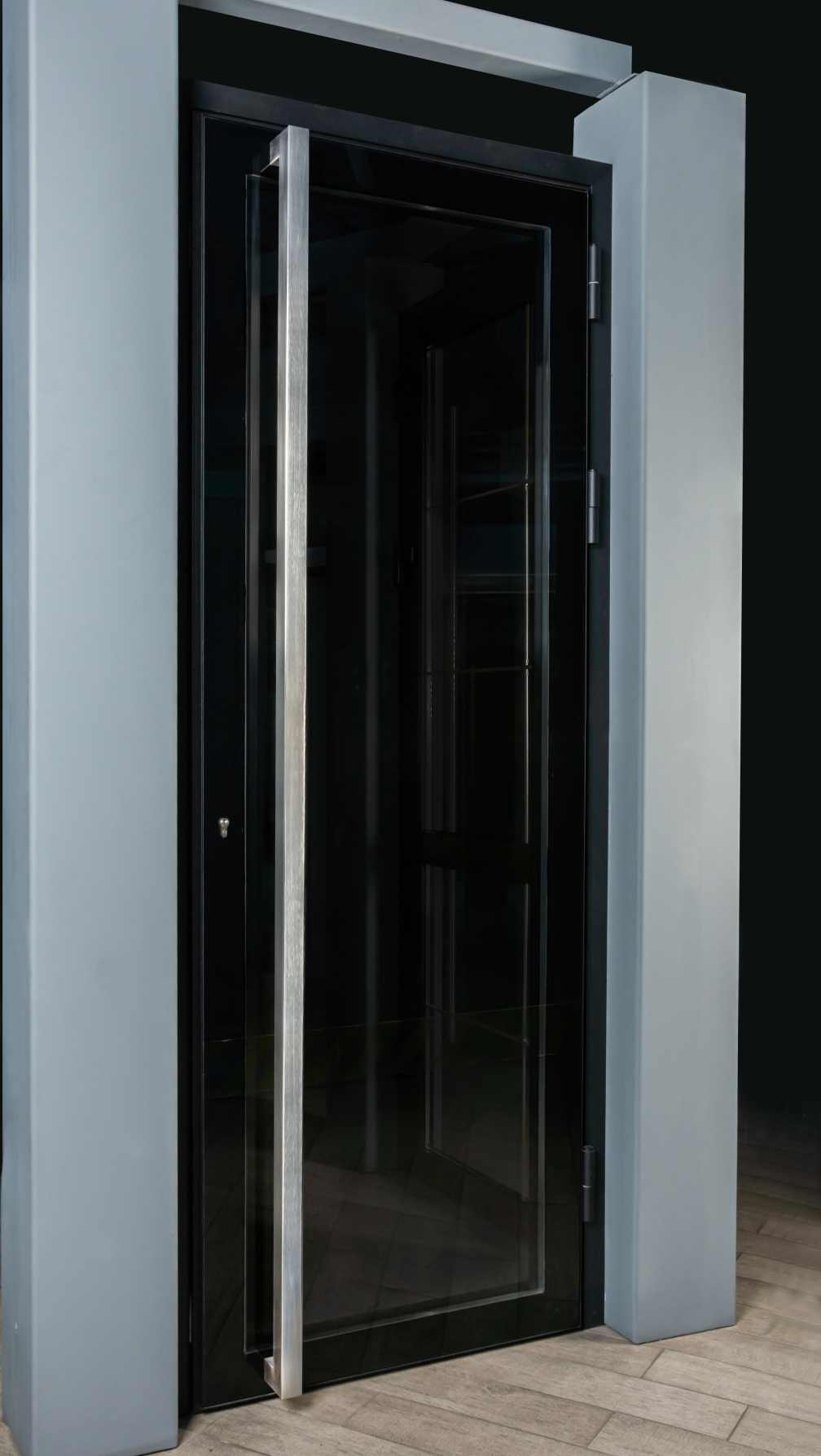 Модель во всю створку двери: Монолитная конструкция протяженностью 2000-3000 мм создает выразительный архитектурный акцент и обеспечивает равномерное распределение нагрузки по всему полотну двери.